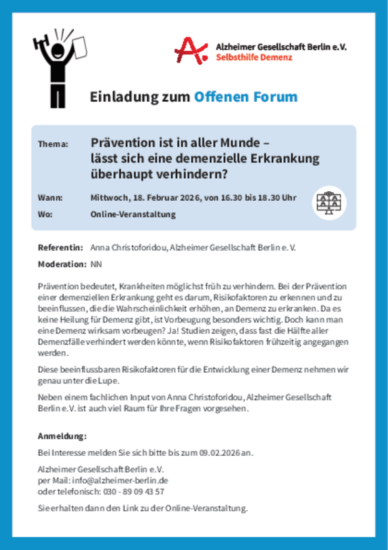 Neben einem fachlichen Input von Anna Christoforidou, Alzheimer Gesellschaft Berlin e.V. ist auch viel Raum für Ihre Fragen vorgesehen.