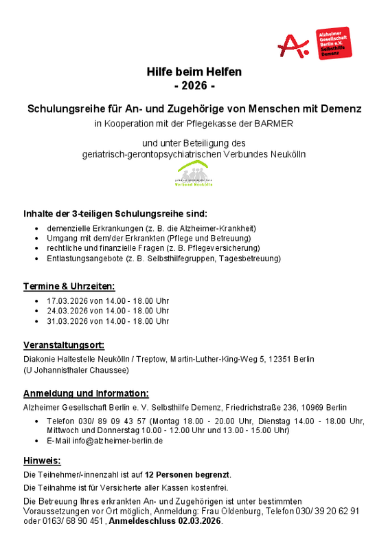 Voraussetzung für die Teilnahme an der Schulung ist, dass Angehörige das erkrankte Familienmitglied in der Häuslichkeit und in Berlin begleiten.